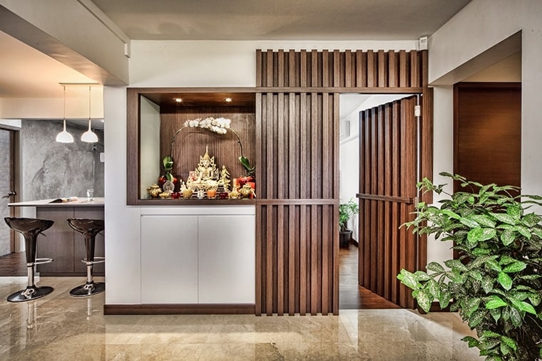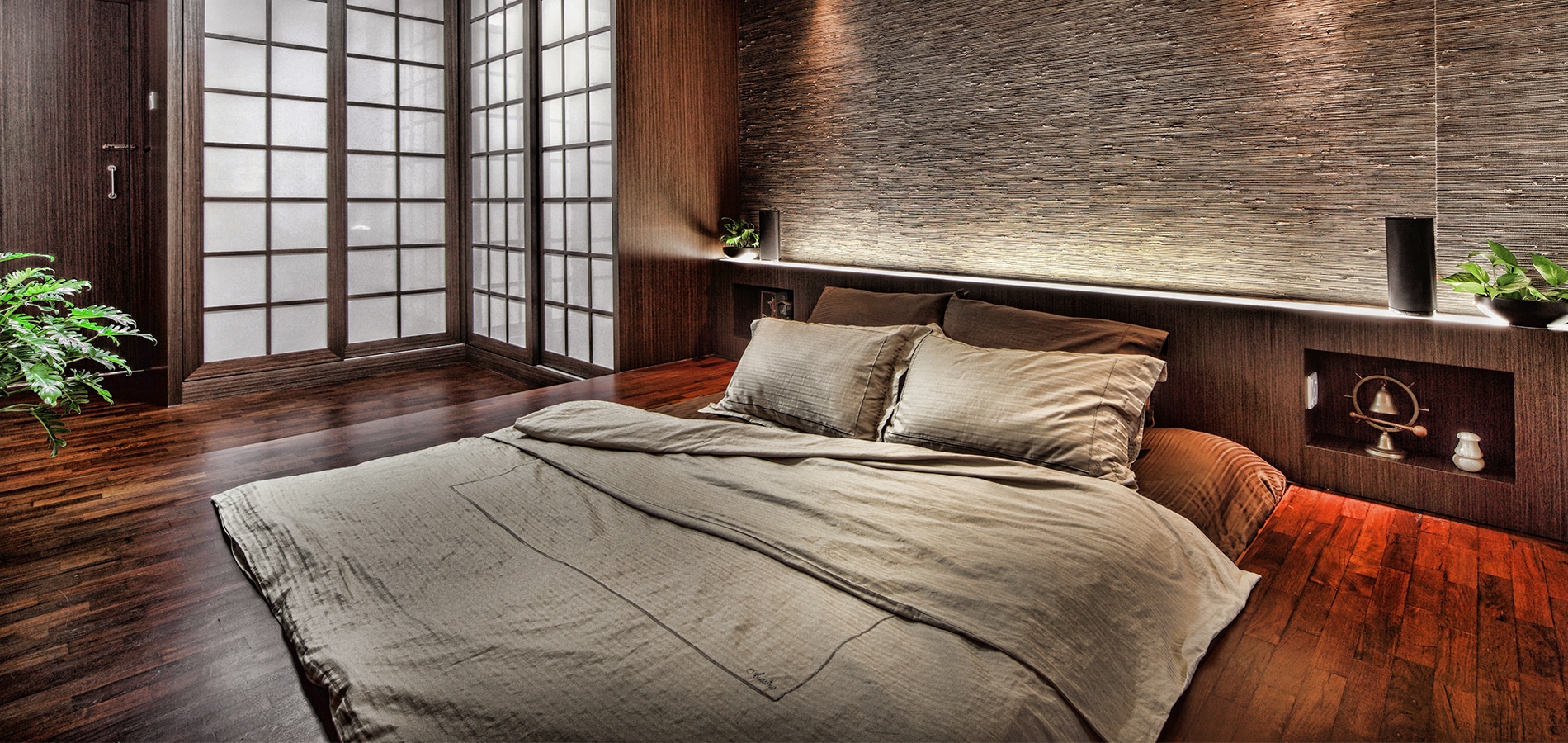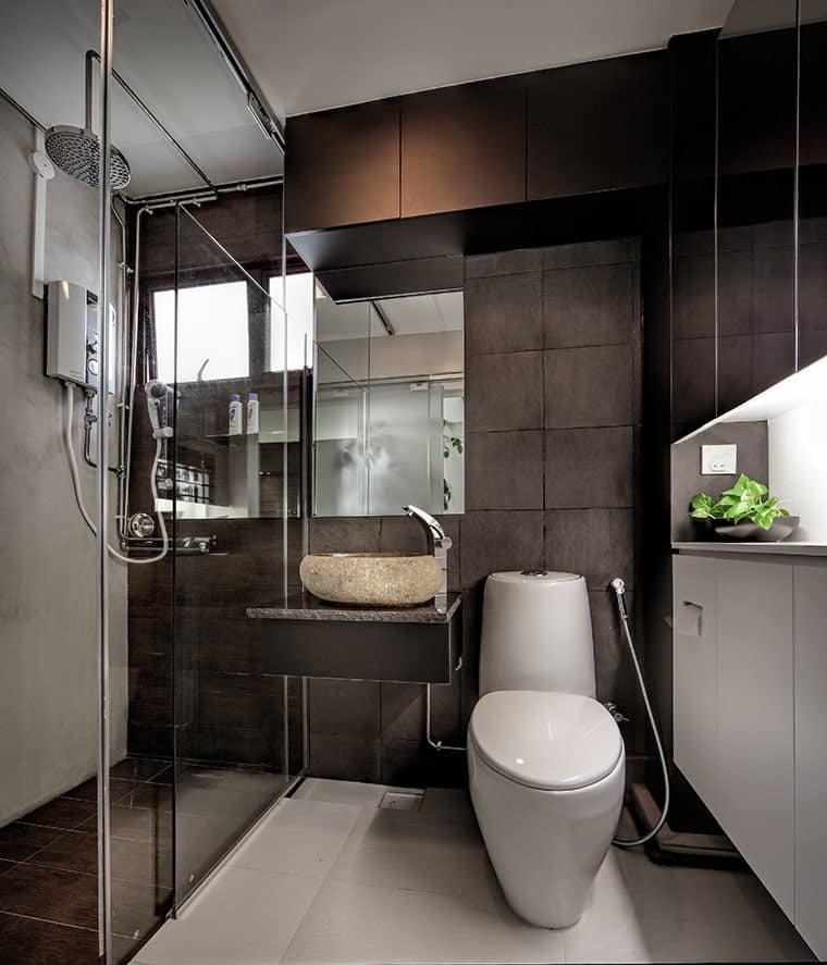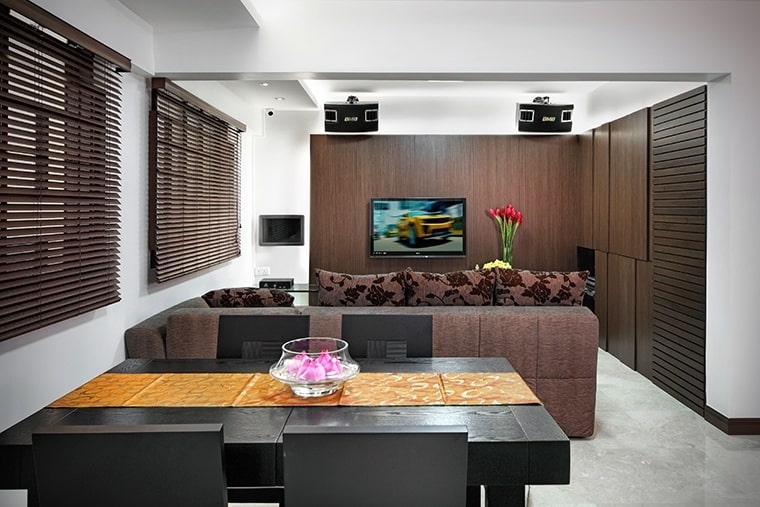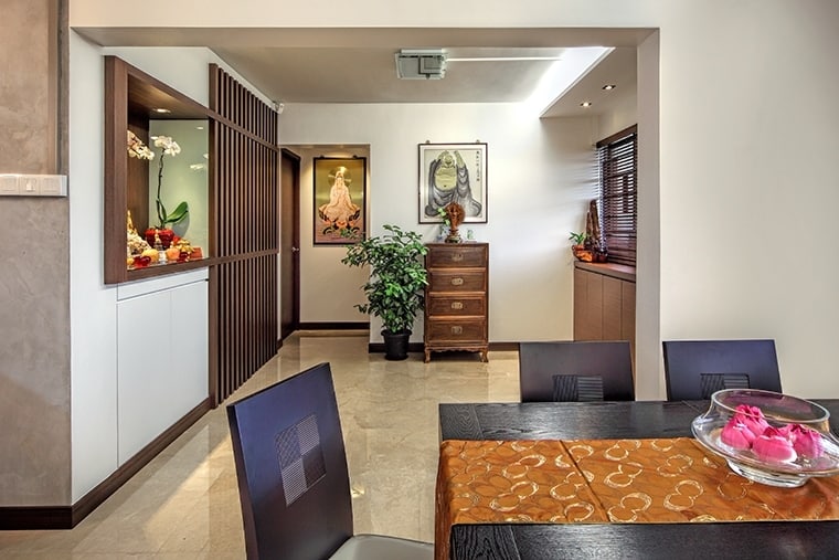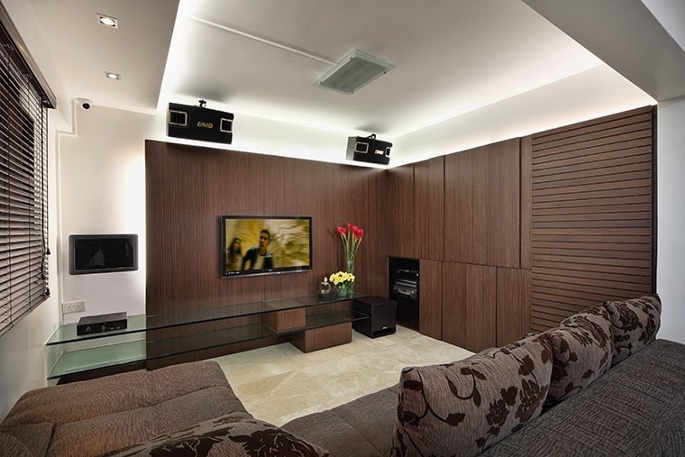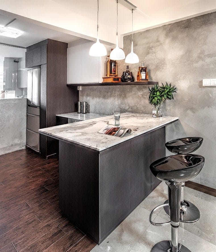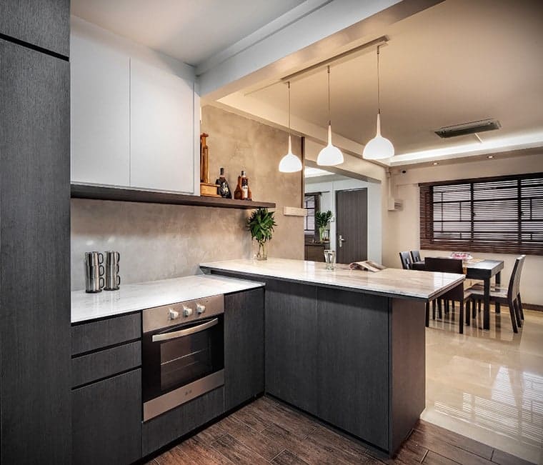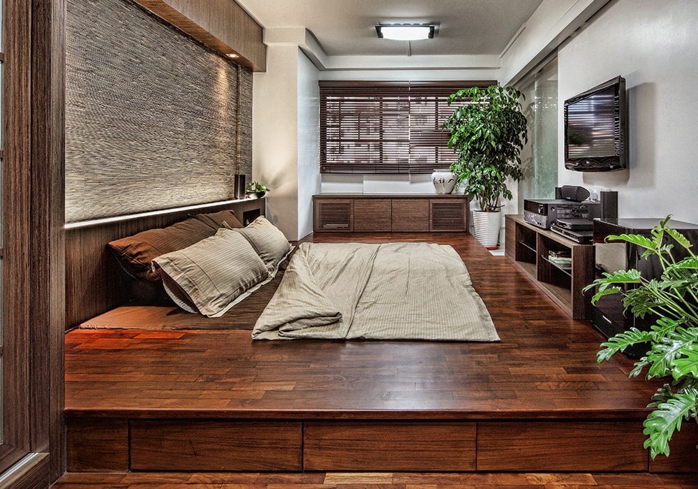 Japanese-style living is mimicked with an ingenious elevated tatami area in the bedroom. Varying wood textures and the warm colour scheme continued in the living room and kitchen blends in perfectly to form an aesthetically pleasing image.